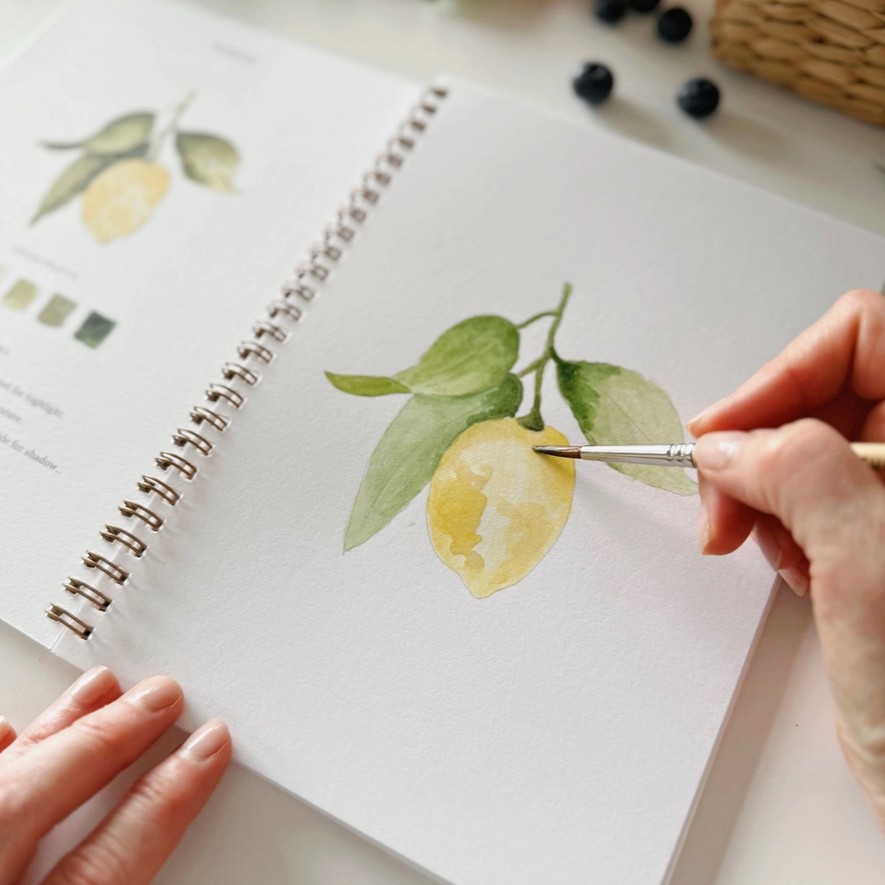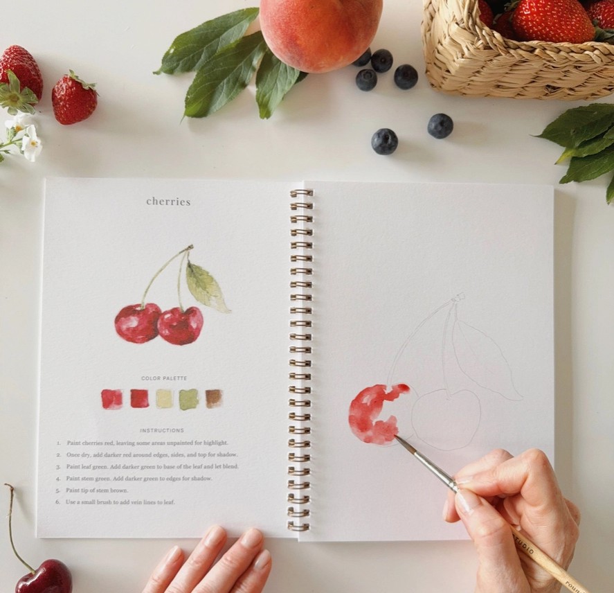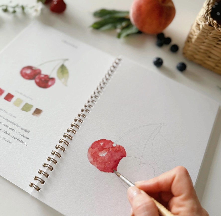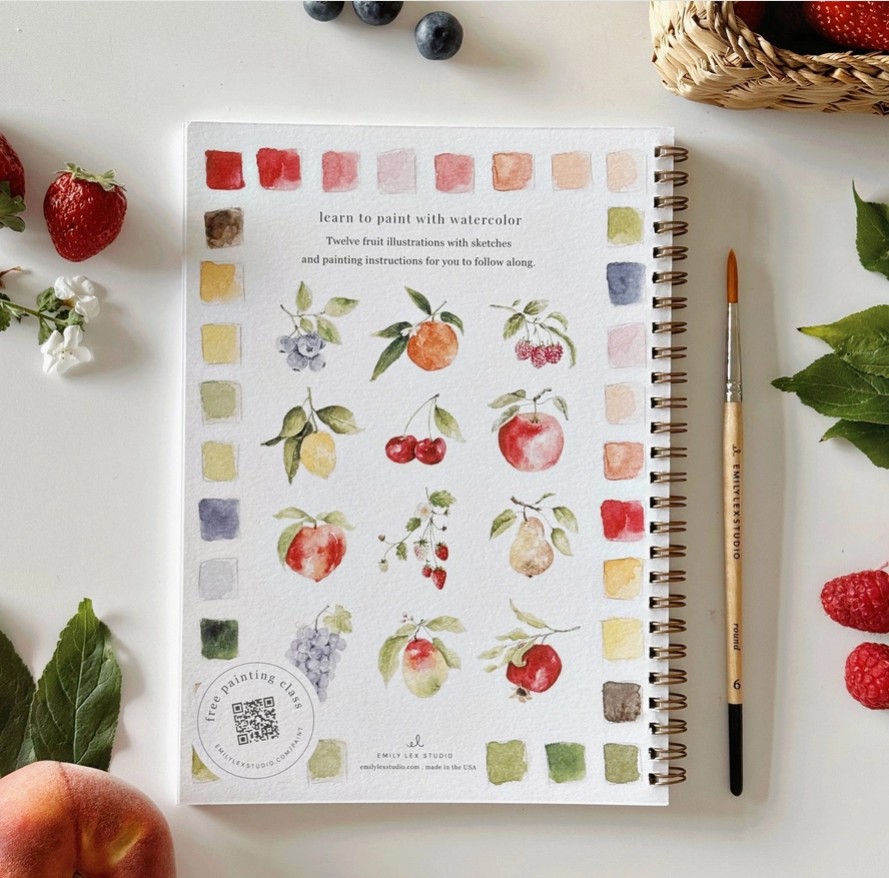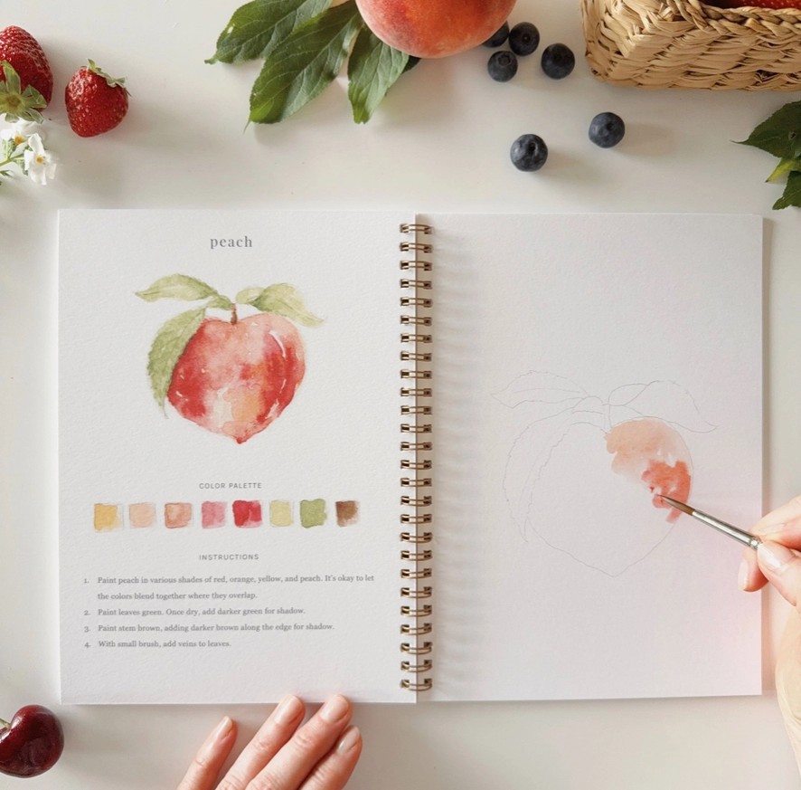 „Fruit Watercolor Workbook“ – tai akvarelės piešimo knyga su 12 vaisių iliustracijų. Joje rasite pavyzdį, kaip turėtų atrodyti baigtas piešinys, išsamius žingsnis po žingsnio nurodymus ir lengvai pažymėtus eskizus, pagal kuriuos galėsite tapyti. Tai tarsi spalvinimo knygelė, tik skirta akvarelei!🍓