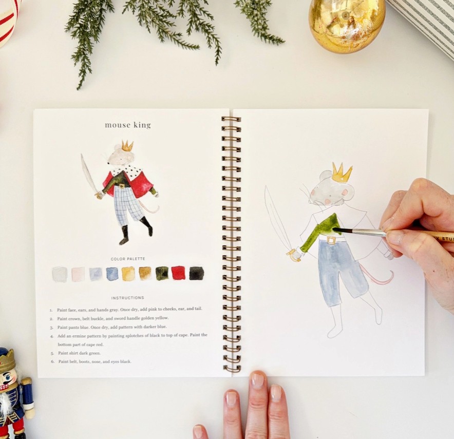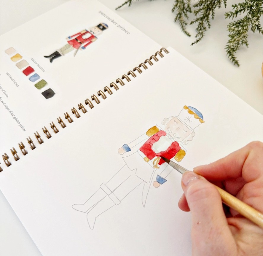 „Nutcracker Watercolor Workbook“ – tai akvarelės piešimo knyga su 12 Spragtuko iliustracijų. Joje rasite pavyzdį, kaip turėtų atrodyti baigtas piešinys, išsamius žingsnis po žingsnio nurodymus ir lengvai pažymėtus eskizus, pagal kuriuos galėsite tapyti. Tai tarsi spalvinimo knygelė, tik skirta akvarelei!🩰