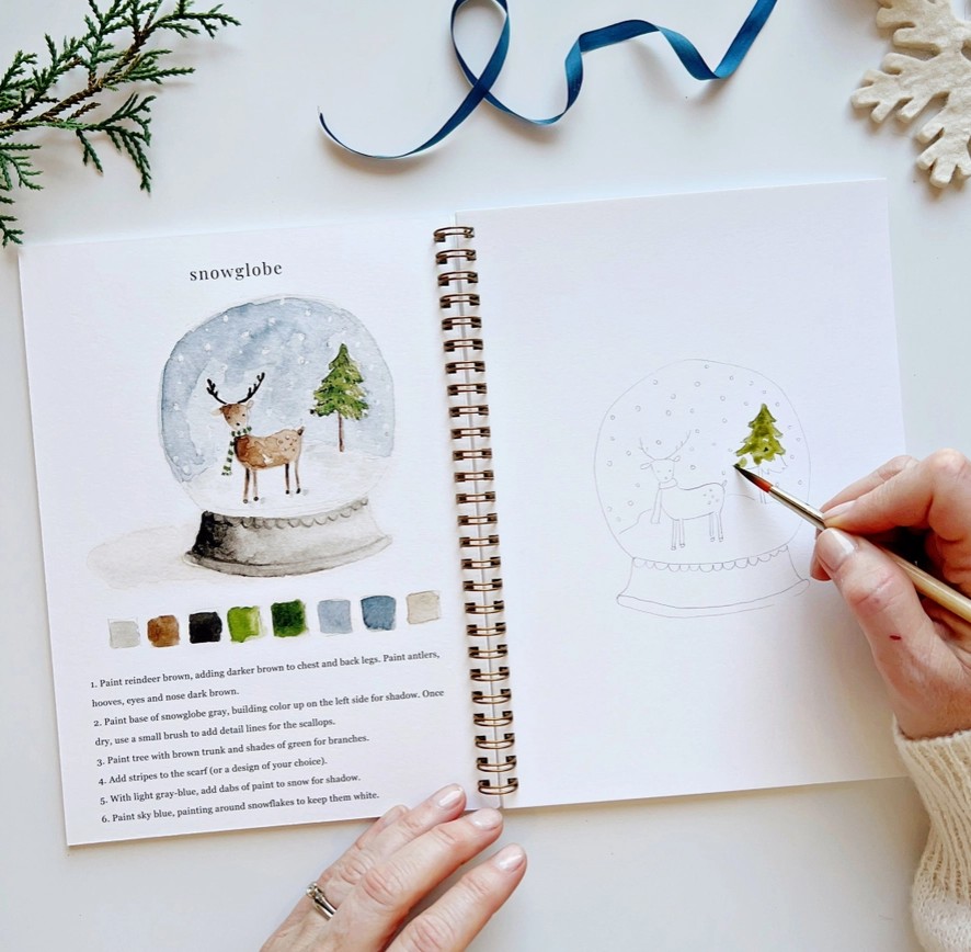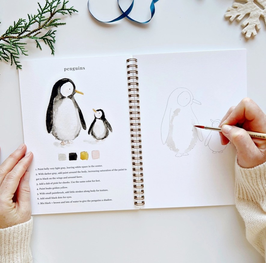 „Winter Watercolor Workbook“ – tai akvarelės piešimo knyga su 12 žiemos iliustracijų. Joje rasite pavyzdį, kaip turėtų atrodyti baigtas piešinys, išsamius žingsnis po žingsnio nurodymus ir lengvai pažymėtus eskizus, pagal kuriuos galėsite tapyti. Tai tarsi spalvinimo knygelė, tik skirta akvarelei!❄️